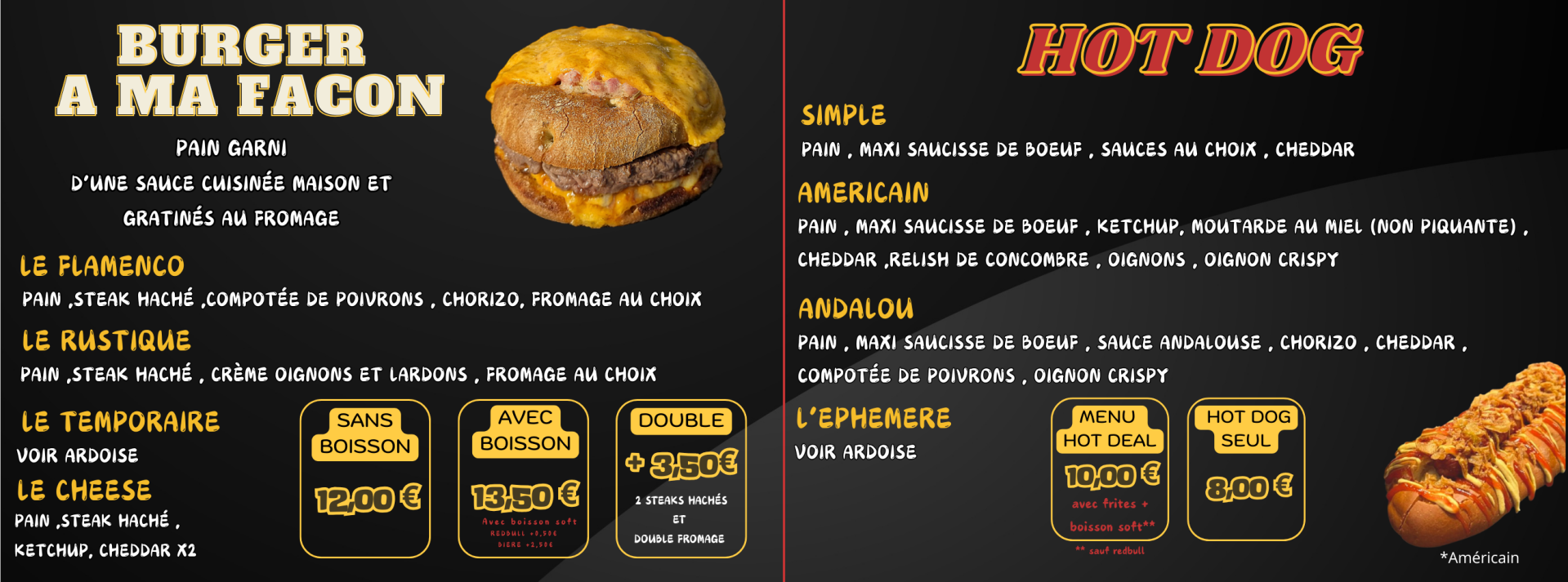 Servi avec frites, au prix de 12€. Pour les plus gourmands : la version double (double steak, double fromage) est disponible avec un supplément de 3,50€.