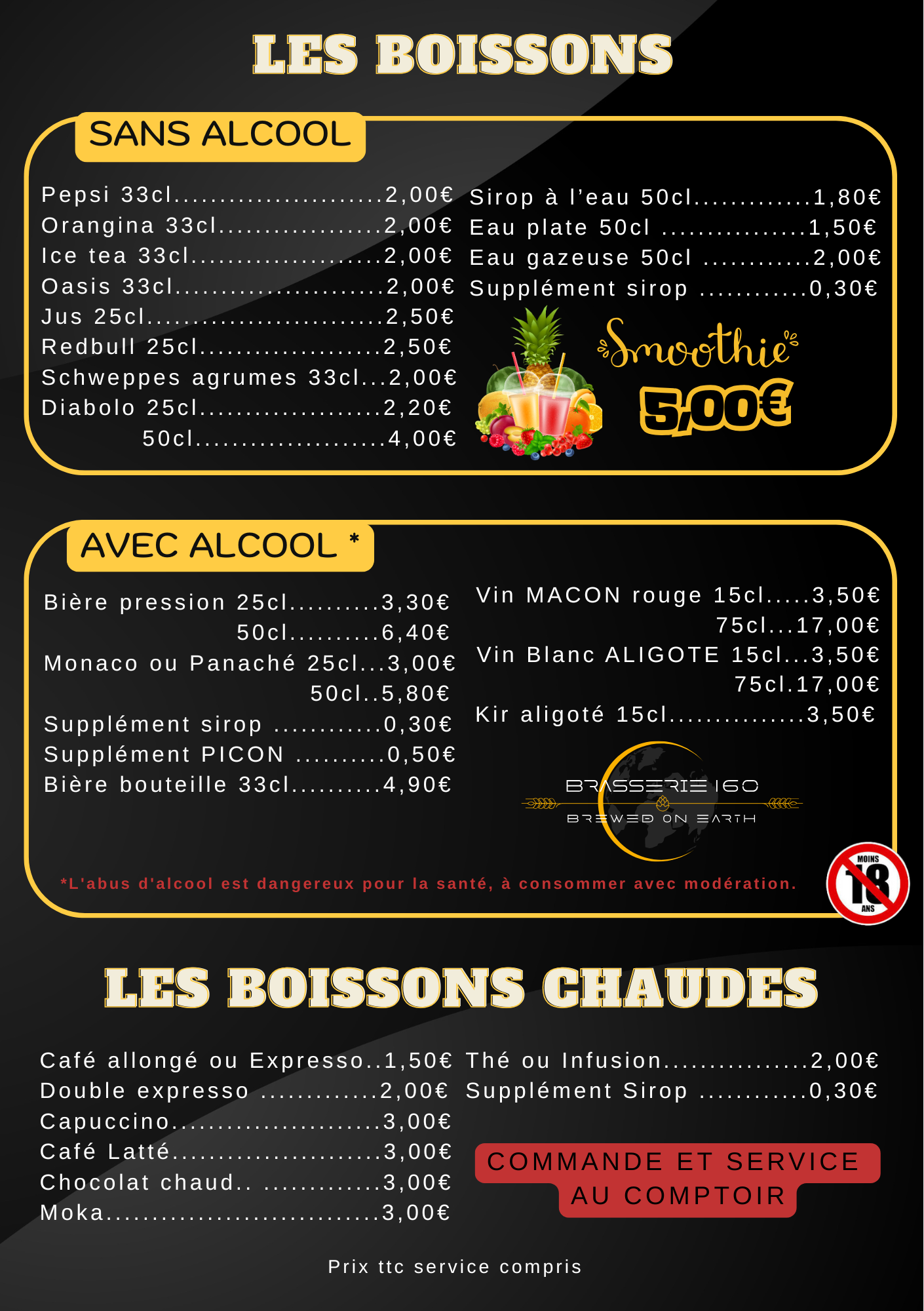 Servi avec frites, au prix de 12€. Pour les plus gourmands : la version double (double steak, double fromage) est disponible avec un supplément de 3,50€.